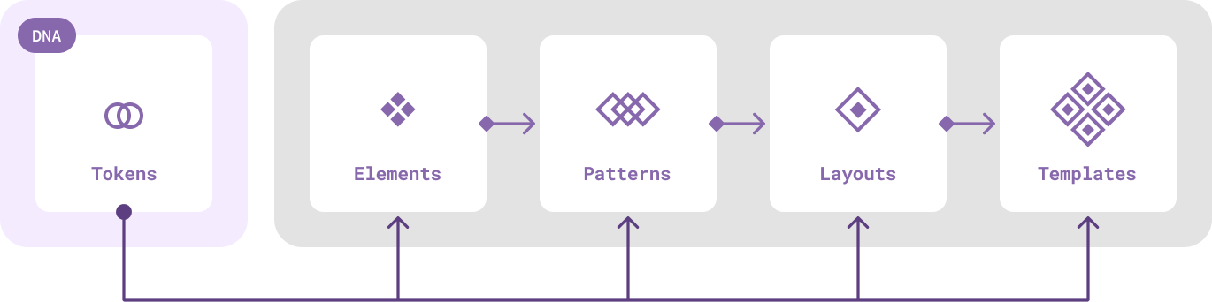 To create a more dynamic and adaptable design system, we transitioned from the established Atomic Design paradigm. Brad Frost had recently updated his original Atomic Design concept to include design tokens as subatomic particles. However, the new version didn’t fully integrate design tokens into the chemistry metaphor. In addition, our team believed that tokens should inform components, patterns, templates, and pages independently.
